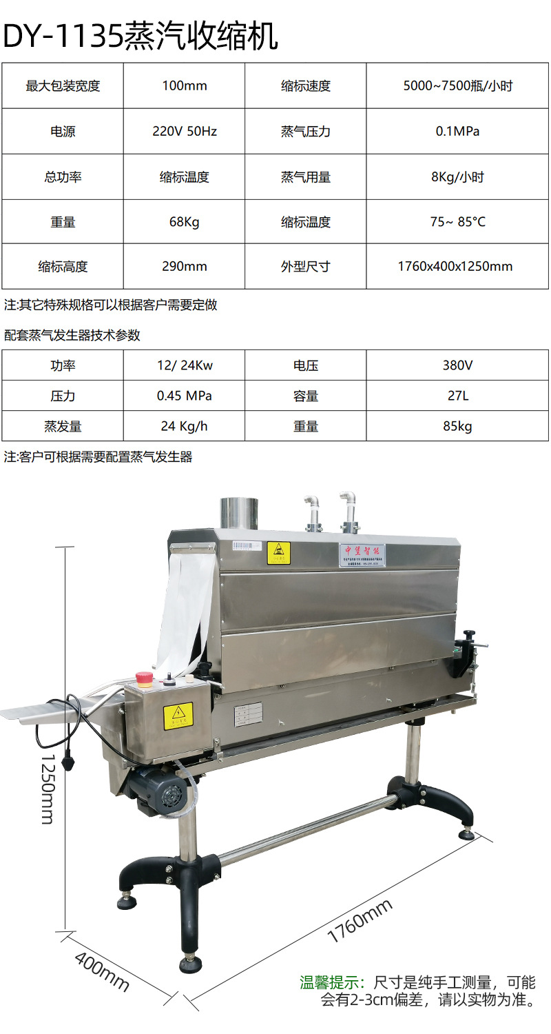 - 安全防護(hù)措施完善:為了確保操作人員的安全,蒸汽收縮機(jī)通常配備了多種安全防護(hù)裝置。如溫度過高自動(dòng)報(bào)警和停機(jī)裝置,當(dāng)蒸汽發(fā)生器的溫度超過安全限制時(shí),機(jī)器會(huì)自動(dòng)發(fā)出警報(bào)并停止工作,防止發(fā)生安全事故。還有防護(hù)欄和緊急停止按鈕,防護(hù)欄可以防止操作人員接觸到高溫的蒸汽部件,緊急停止按鈕則在突發(fā)情況下(如產(chǎn)品卡住、冒煙等)能讓機(jī)器立即停止運(yùn)行