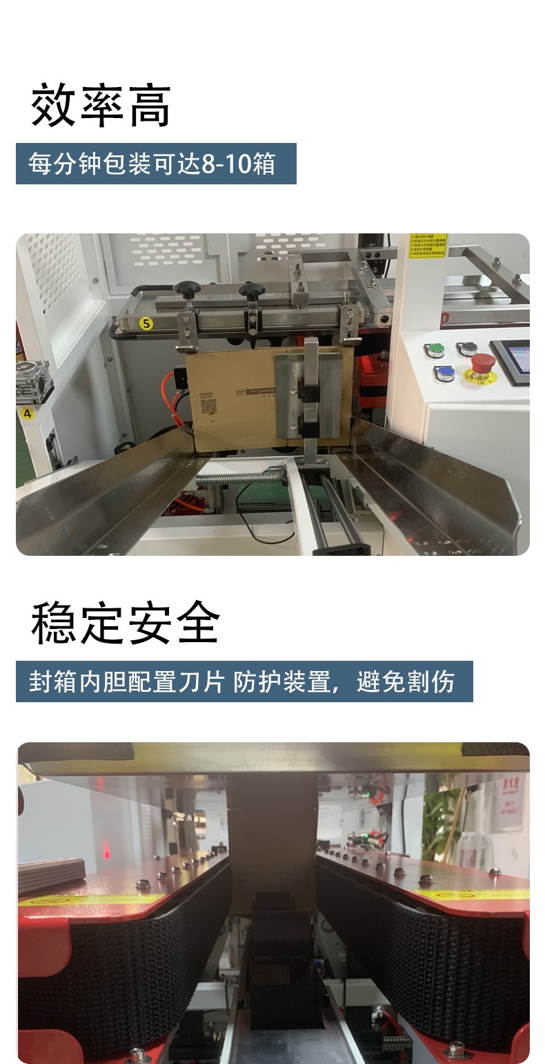 - 自動化程度高:一次完成紙箱吸箱、開箱、成型、折底、封底等包裝工序,可大大減少生產(chǎn)人員和勞動強度。