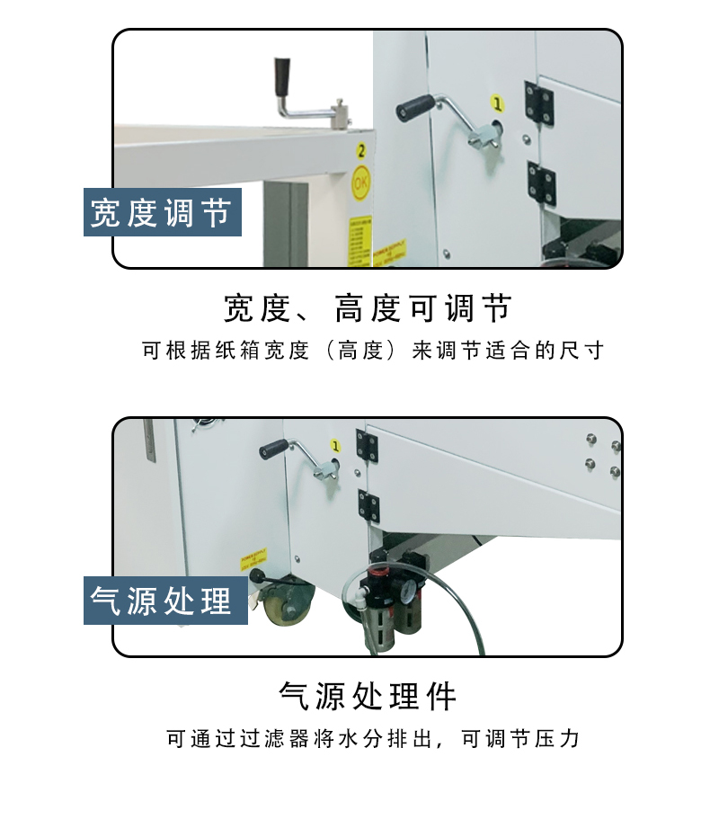 - 紙箱適應(yīng)性強:適用紙箱范圍廣,不同大小紙箱調(diào)整簡便快捷,變換紙箱規(guī)格時,手動調(diào)整一般只需 1-2 分鐘。