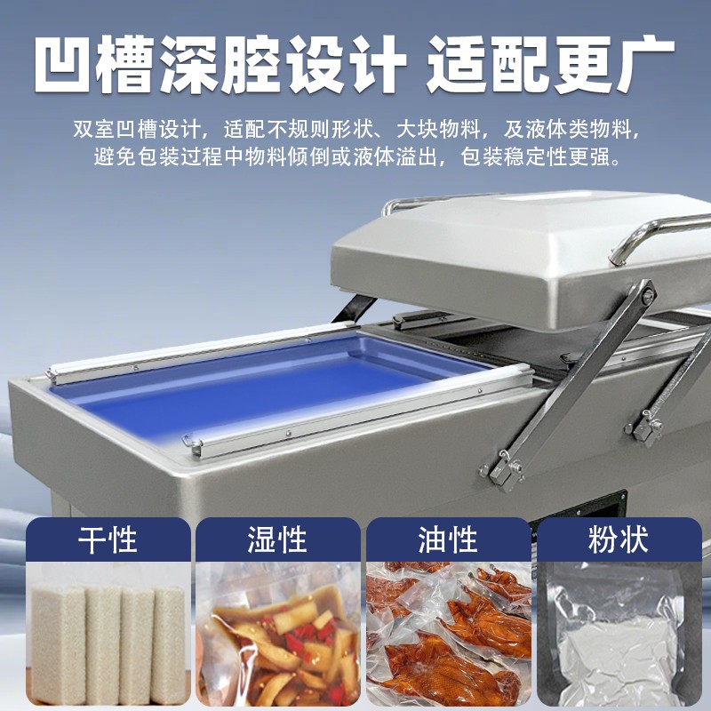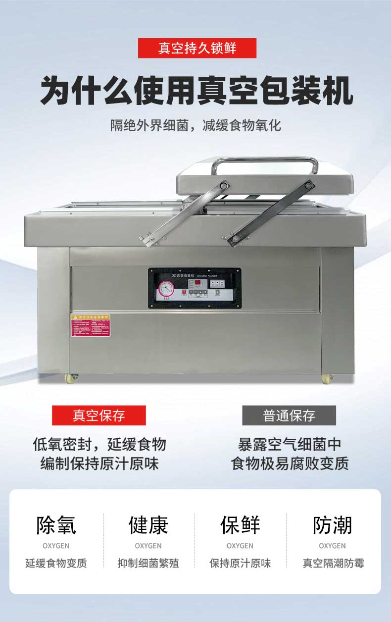 雙室真空包裝機(jī)可在真空包裝的基礎(chǔ)上,向包裝袋內(nèi)充入氮?dú)狻⒍趸嫉榷栊詺怏w或混合氣體,起到更好的防腐、防潮、防氧化等保質(zhì)效果