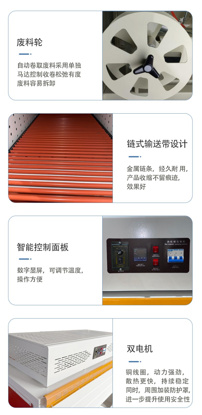 全自動(dòng)邊封熱收縮機(jī)的控制系統(tǒng)是整個(gè)設(shè)備的 “大腦”,它負(fù)責(zé)協(xié)調(diào)和控制各個(gè)部件的運(yùn)行,以實(shí)現(xiàn)高效、精準(zhǔn)的包裝過(guò)程。以下是對(duì)其控制系統(tǒng)的詳細(xì)介紹: 硬件組成 PLC 控制器 核心運(yùn)算與控制:PLC(可編程邏輯控制器)是控制系統(tǒng)的核心部件。它接收來(lái)自各個(gè)傳感器的信號(hào),如產(chǎn)品到位傳感器、薄膜檢測(cè)傳感器等,根據(jù)預(yù)設(shè)的程序進(jìn)行邏輯運(yùn)算和處理,并向各個(gè)執(zhí)行元件發(fā)送控制指令,如驅(qū)動(dòng)電機(jī)、氣動(dòng)元件等,以精確控制送料、套膜、封切和熱收縮等各個(gè)包裝工序的執(zhí)行順序和時(shí)間。 穩(wěn)定性與可靠性:具有高可靠性,能在惡劣的工業(yè)環(huán)境下穩(wěn)定工作,抗干擾能力強(qiáng),可確保設(shè)備長(zhǎng)時(shí)間連續(xù)運(yùn)行而不出現(xiàn)故障,保證包裝過(guò)程的穩(wěn)定性和一致性。 觸摸屏 人機(jī)交互界面:觸摸屏作為人機(jī)交互的窗口,為操作人員提供了直觀、便捷的操作平臺(tái)。操作人員可以通過(guò)觸摸屏幕輕松設(shè)置各種包裝參數(shù),如封切時(shí)間、收縮溫度、輸送速度等。同時(shí),觸摸屏還能實(shí)時(shí)顯示設(shè)備的運(yùn)行狀態(tài),如當(dāng)前工作模式、各部件的運(yùn)行參數(shù)、故障報(bào)警信息等,方便操作人員隨時(shí)了解設(shè)備運(yùn)行情況并及時(shí)進(jìn)行調(diào)整和維護(hù)。 參數(shù)設(shè)置與存儲(chǔ):支持多種參數(shù)的設(shè)置和存儲(chǔ),可根據(jù)不同的產(chǎn)品包裝需求,預(yù)設(shè)多個(gè)包裝方案,操作人員只需在觸摸屏上選擇相應(yīng)的方案,即可快速切換設(shè)備的工作參數(shù),無(wú)需重新逐一設(shè)置,大大提高了工作效率。此外,觸摸屏還具備密碼保護(hù)功能,可防止非授權(quán)人員隨意修改參數(shù),確保設(shè)備運(yùn)行的安全性和穩(wěn)定性。 軟件功能 參數(shù)設(shè)置與調(diào)整功能 精確控制:通過(guò)控制系統(tǒng)的軟件,能夠精確設(shè)置和調(diào)整封切時(shí)間、收縮溫度、輸送速度等關(guān)鍵參數(shù)。例如,封切時(shí)間可以精確到毫秒級(jí),收縮溫度可在一定范圍內(nèi)以較小的溫度梯度進(jìn)行調(diào)整,輸送速度也能根據(jù)產(chǎn)品尺寸和包裝要求進(jìn)行精確設(shè)定,從而保證不同產(chǎn)品都能獲得理想的包裝效果。 自動(dòng)調(diào)節(jié)與優(yōu)化:部分先進(jìn)的控制系統(tǒng)還具備自動(dòng)調(diào)節(jié)功能,能夠根據(jù)預(yù)設(shè)的包裝質(zhì)量標(biāo)準(zhǔn),自動(dòng)對(duì)參數(shù)進(jìn)行微調(diào)優(yōu)化。例如,在熱收縮過(guò)程中,系統(tǒng)可根據(jù)熱收縮膜的收縮情況,自動(dòng)調(diào)整加熱溫度和風(fēng)機(jī)風(fēng)速,以確保熱收縮膜均勻收縮,緊密貼合產(chǎn)品表面。 運(yùn)行監(jiān)控與故障診斷功能 實(shí)時(shí)監(jiān)控:控制系統(tǒng)實(shí)時(shí)監(jiān)控設(shè)備各個(gè)部件的運(yùn)行狀態(tài),包括電機(jī)的轉(zhuǎn)速、加熱元件的溫度、氣動(dòng)元件的壓力等。通過(guò)傳感器將這些實(shí)時(shí)數(shù)據(jù)反饋給 PLC 控制器,再由觸摸屏以圖形化界面的形式展示給操作人員,使操作人員能夠直觀地了解設(shè)備的運(yùn)行情況。 故障診斷與報(bào)警:一旦檢測(cè)到設(shè)備出現(xiàn)異常情況,如溫度過(guò)高、電機(jī)過(guò)載、薄膜供應(yīng)不足等,控制系統(tǒng)會(huì)立即進(jìn)行故障診斷,并在觸摸屏上顯示詳細(xì)的故障信息和報(bào)警提示。同時(shí),系統(tǒng)還會(huì)自動(dòng)記錄故障發(fā)生的時(shí)間、位置和相關(guān)參數(shù),以便維修人員快速定位和排除故障。有些控制系統(tǒng)還具備遠(yuǎn)程監(jiān)控和報(bào)警功能,可通過(guò)網(wǎng)絡(luò)將故障信息發(fā)送給相關(guān)人員的手機(jī)或電腦,實(shí)現(xiàn)及時(shí)響應(yīng)和處理。 生產(chǎn)數(shù)據(jù)統(tǒng)計(jì)與管理功能 數(shù)據(jù)統(tǒng)計(jì):控制系統(tǒng)能夠自動(dòng)統(tǒng)計(jì)生產(chǎn)過(guò)程中的各種數(shù)據(jù),如包裝數(shù)量、生產(chǎn)速度、設(shè)備運(yùn)行時(shí)間、故障停機(jī)時(shí)間等。這些數(shù)據(jù)對(duì)于企業(yè)的生產(chǎn)管理和質(zhì)量控制具有重要意義,可幫助企業(yè)分析生產(chǎn)效率、評(píng)估設(shè)備性能、制定生產(chǎn)計(jì)劃和進(jìn)行成本核算。 數(shù)據(jù)存儲(chǔ)與查詢(xún):生產(chǎn)數(shù)據(jù)可存儲(chǔ)在控制系統(tǒng)的內(nèi)存或外部存儲(chǔ)設(shè)備中,方便操作人員隨時(shí)查詢(xún)和調(diào)用。同時(shí),數(shù)據(jù)還可通過(guò)網(wǎng)絡(luò)接口導(dǎo)出到計(jì)算機(jī)或企業(yè)的生產(chǎn)管理系統(tǒng)中,以便進(jìn)行進(jìn)一步的分析和處理,為企業(yè)的決策提供數(shù)據(jù)支持。 通信與聯(lián)網(wǎng)功能 內(nèi)部通信:控制系統(tǒng)通過(guò)內(nèi)部通信總線(xiàn)實(shí)現(xiàn)各個(gè)硬件模塊之間的高速數(shù)據(jù)傳輸和通信,確保 PLC 控制器、觸摸屏、傳感器和執(zhí)行元件等之間的信息交互準(zhǔn)確、及時(shí),從而實(shí)現(xiàn)設(shè