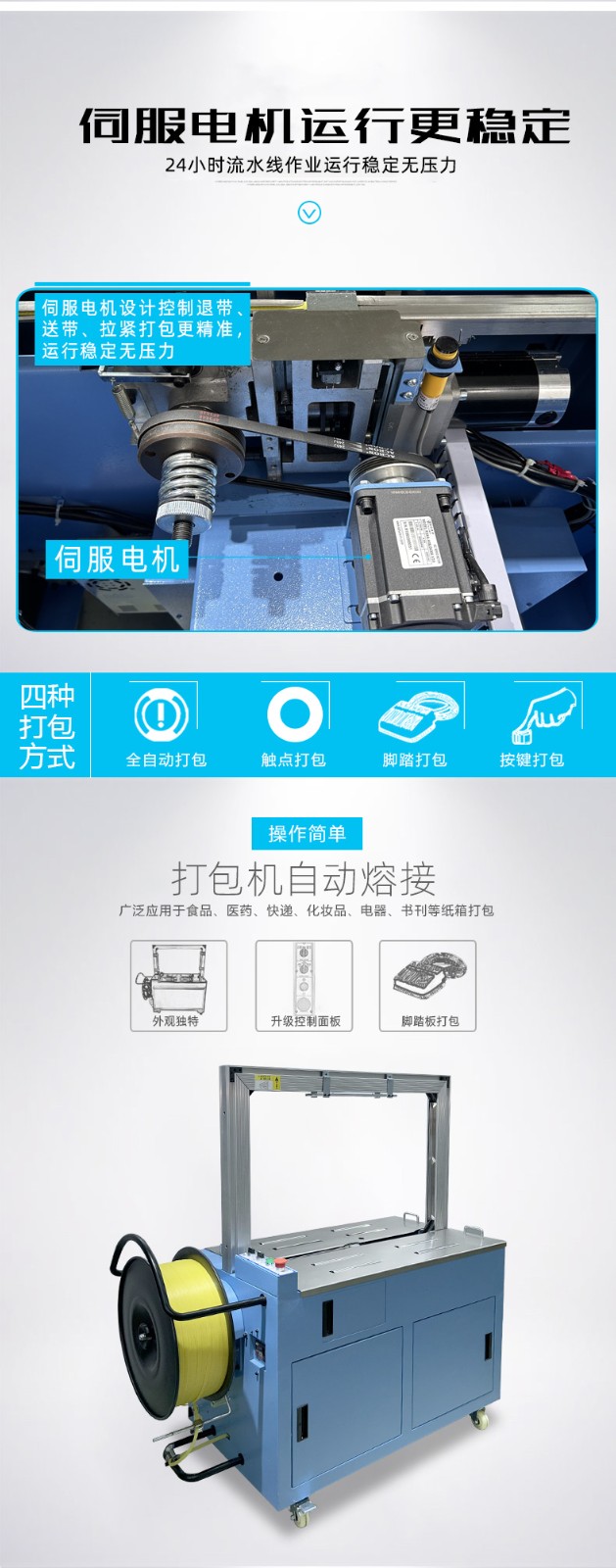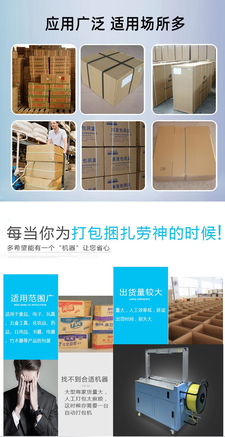 - 半自動打包機(jī):適用于小型工廠、商店、快遞公司網(wǎng)點、辦公室等,這些地方打包量相對較小,使用半自動打包機(jī)既能滿足打包需求,又能在設(shè)備成本和人工成本之間取得較好的平衡