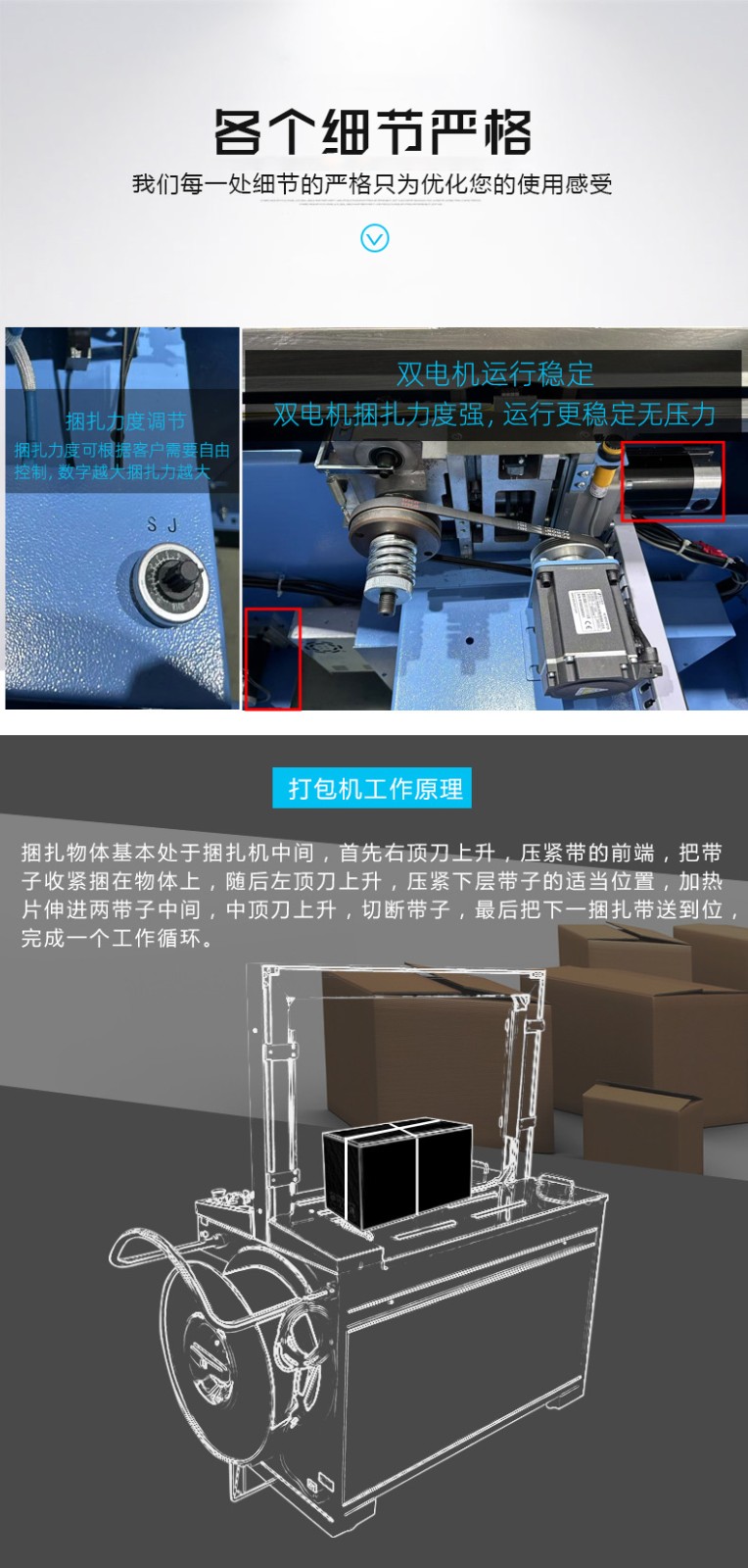 - 半自動打包機(jī):需要人工參與部分環(huán)節(jié),通常是人工將打包帶繞過物品,放置在打包機(jī)的特定位置,然后啟動機(jī)器,由機(jī)器完成收緊、封口和切斷等操作。