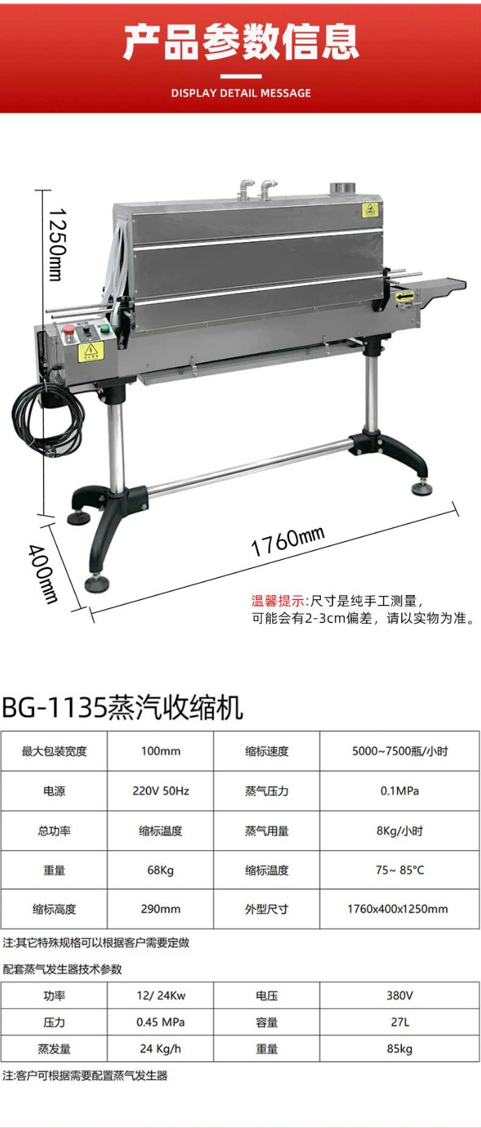 - 安全性高:一些蒸汽收縮機(jī)自帶蒸汽發(fā)生器,配備漏電保護(hù)開關(guān)、缺水報(bào)警保護(hù)、自動(dòng)補(bǔ)水等系統(tǒng),當(dāng)出現(xiàn)漏電、缺水等情況時(shí)能及時(shí)采取保護(hù)措施,提高設(shè)備的使用安全性 2。
