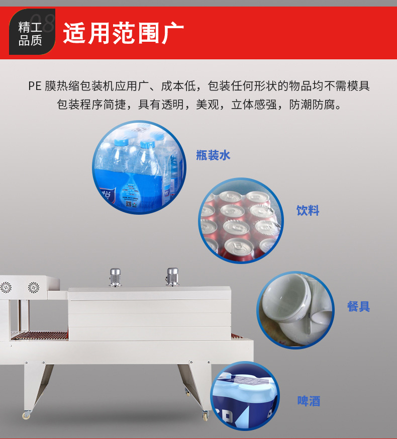 - 適用范圍廣:可以用于包裝各種形狀和尺寸的產(chǎn)品,無論是規(guī)則的圓柱體、長(zhǎng)方體,還是不規(guī)則的產(chǎn)品,只要選擇合適的 PE 薄膜,都可以用這種機(jī)器進(jìn)行包裝。而且它可以與其他包裝設(shè)備和生產(chǎn)線集成,實(shí)現(xiàn)自動(dòng)化包裝,提高生產(chǎn)效率。