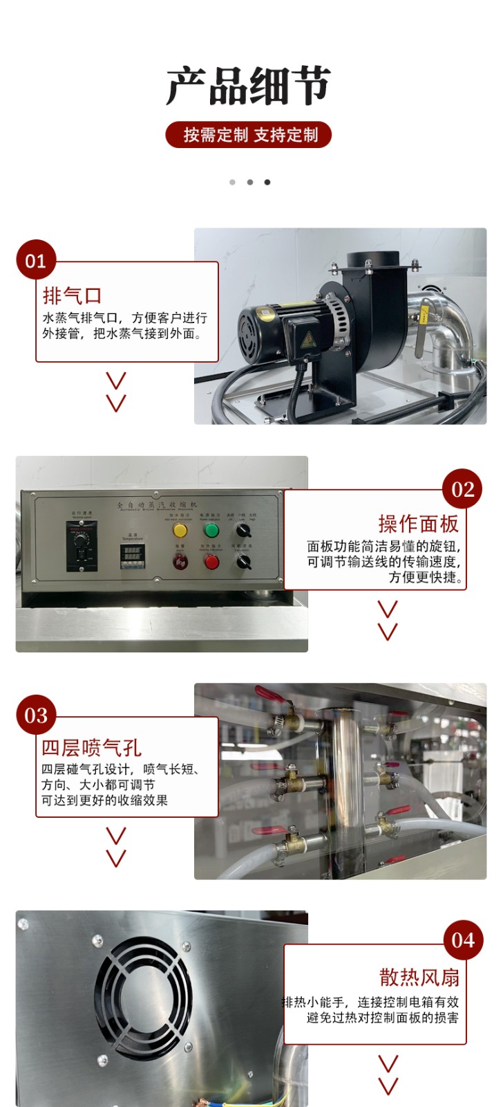 設(shè)備的結(jié)構(gòu)設(shè)計圍繞 “蒸汽產(chǎn)生 - 加熱收縮 - 產(chǎn)品輸送 - 參數(shù)控制” 展開,核心部件包括四大模塊: