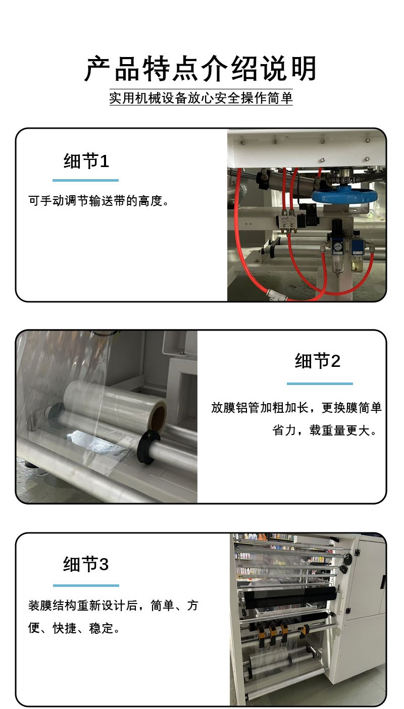 - 壓力調(diào)節(jié)機(jī)構(gòu):用于控制封刀對(duì)薄膜的壓力??梢允菤鈮菏秸{(diào)節(jié)機(jī)構(gòu),通過調(diào)節(jié)氣缸的氣壓來改變封刀的壓力;也可以是機(jī)械彈簧式調(diào)節(jié)機(jī)構(gòu),通過調(diào)整彈簧的壓縮程度來控制壓力。這種壓力調(diào)節(jié)能夠適應(yīng)不同厚度的薄膜和產(chǎn)品的包裝要求。